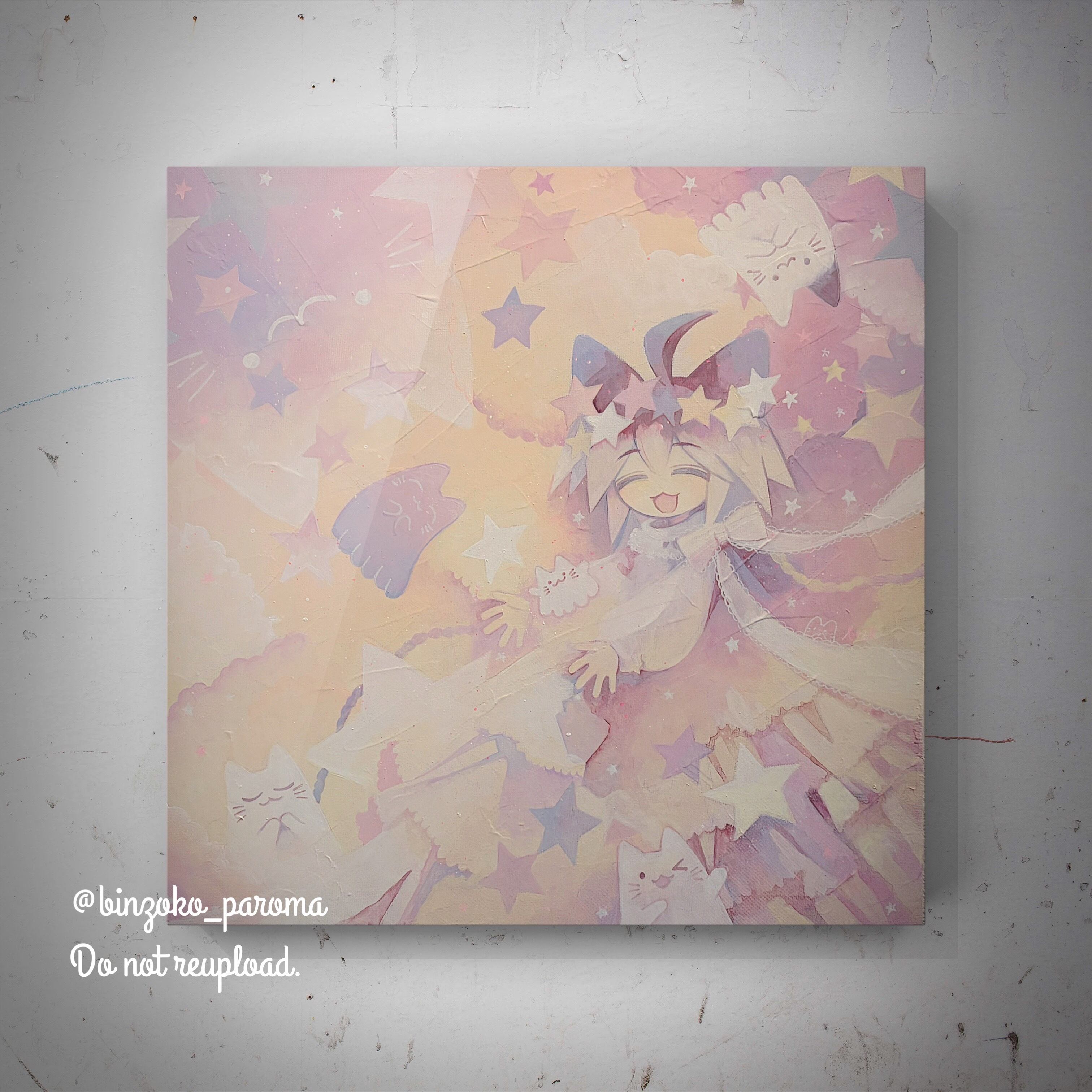 ふんわりした厚塗りの画面&ゆめかわな世界観を詰め込んだかわいい作品です。壁掛けもできますが、ミニイーゼルでも飾る事が可能です。